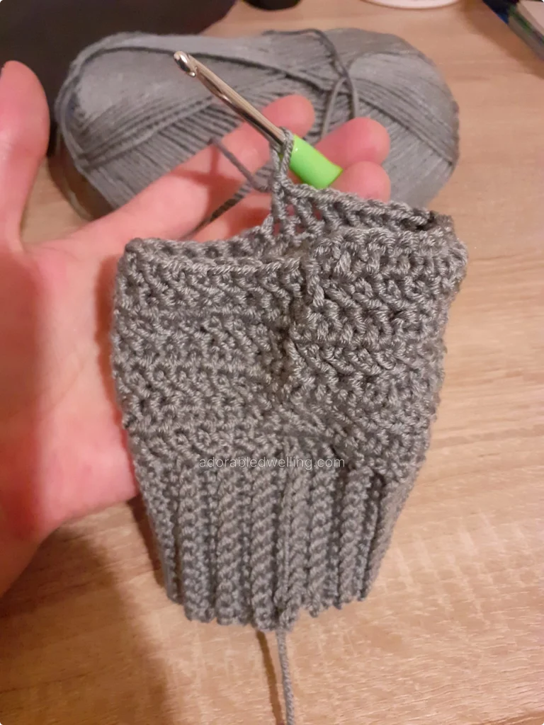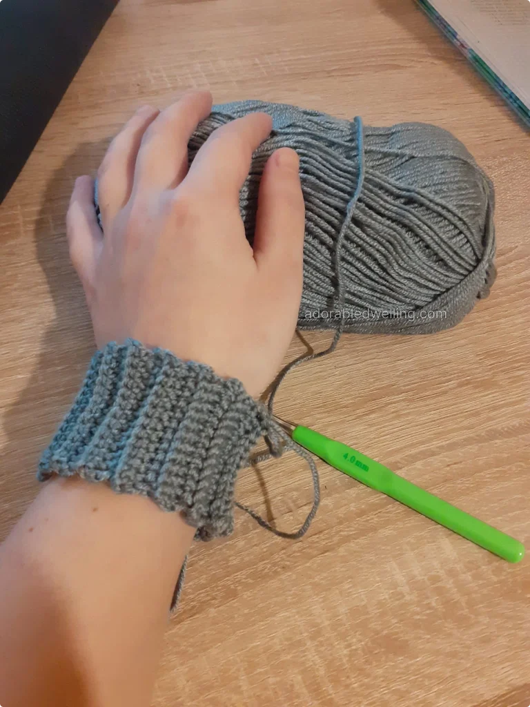 Repeat step 2 for a further 31 rows, totaling 33 rows of a ribbed SC. Join back to the starting chain by slip stitching into each of your beginning stitches to close the edge that will sit around the wrist.