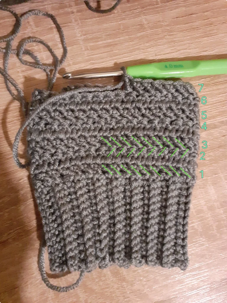 Repeat step 2 until you have a total of 8 alternating herringbone stitch rows. I will show you how to count the rows in the picture below.